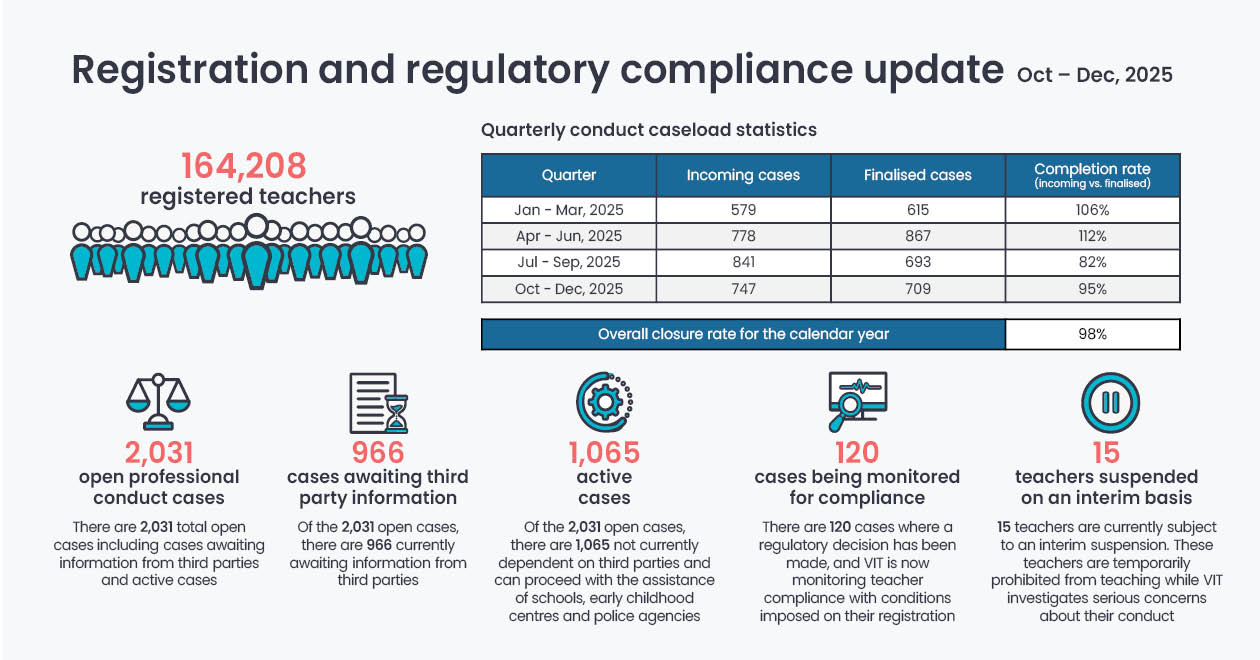 Throughout Quarter 4 (Q4) 2025 (October – December 2025), the Victorian Institute of Teaching (VIT) continued to perform its regulatory functions with a focus on timely registration decisions, clear guidance for applicants and employers, and risk-based professional conduct processes.